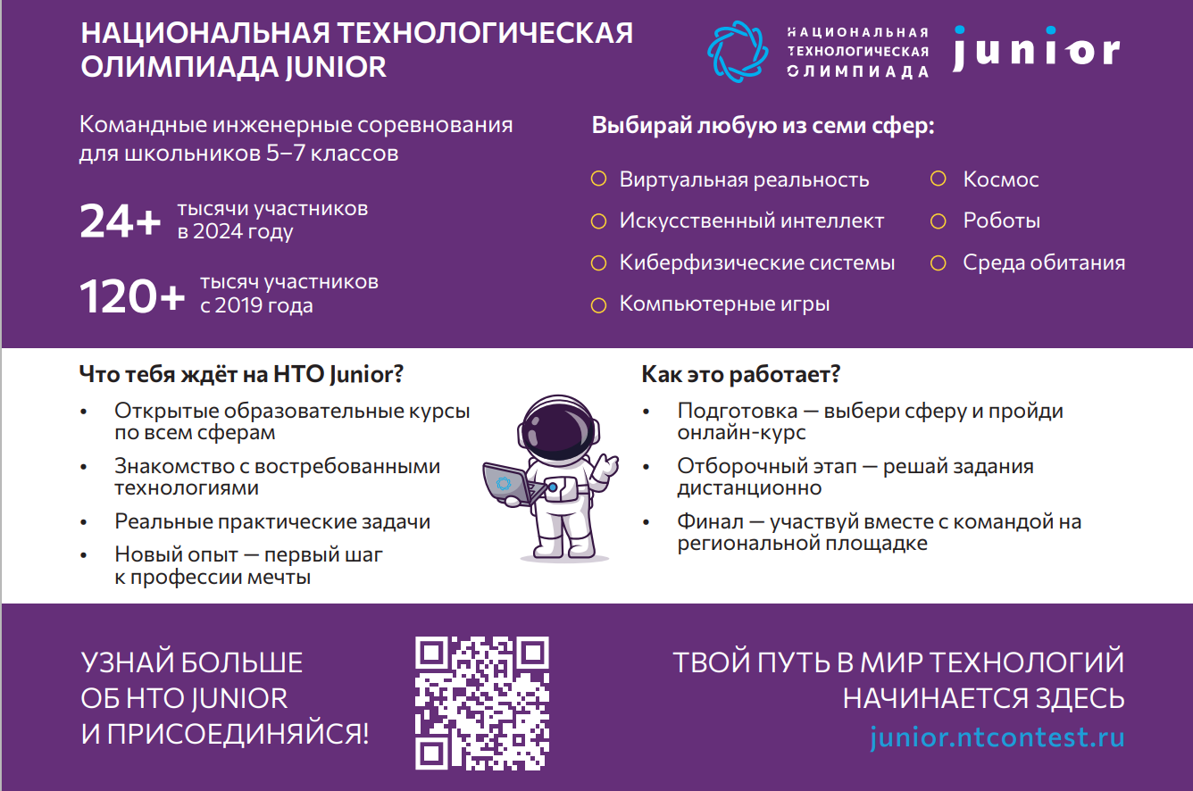 Стать участниками Национальной технологической олимпиады Junior (НТО Junior) могут ученики 5-7 классов, которые хотят сделать шаг в будущее технологий!