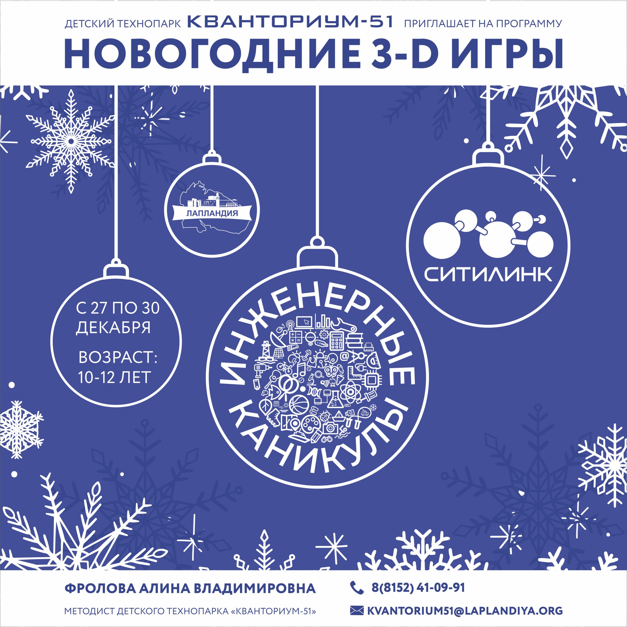 Хотите, чтобы предновогодние дни стали по-настоящему волшебными и наполнились вдохновением? Приглашаем вас на программу «Новогодние 3D-игры»! Когда: с 27 по 30 декабря. Возраст: 10–12 лет. На программе вы:– освоите безопасное и эффективное обращение с профессиональным оборудованием: графическим планшетом, 3D-принтером и Подробнее …